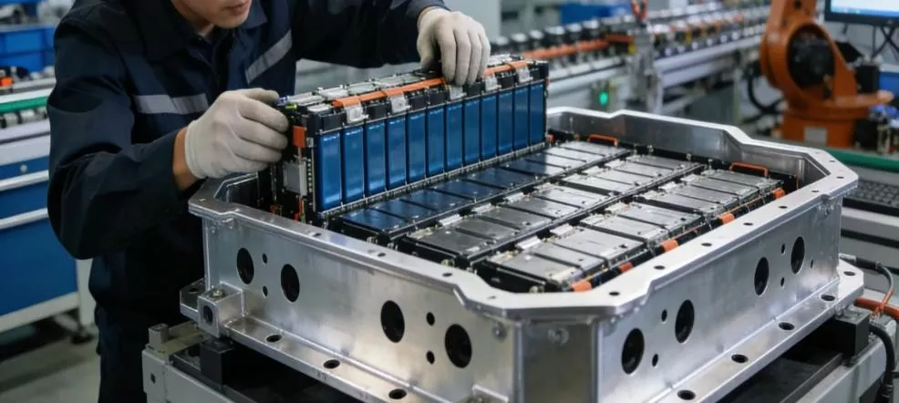 قطاع النقل: لقطة مقربة لتجميع إطار مجموعة بطاريات مركبات الطاقة الجديدة