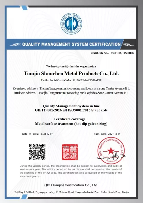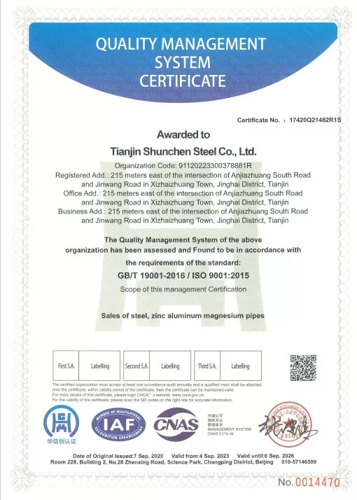 المعايير: GB/T 3091-2015 "أنابيب فولاذية ملحومة لنقل السوائل ذات الضغط المنخفض"، GB/T 13912-2020 "أنابيب فولاذية مجلفنة بالغمس الساخن". لقد اجتاز المنتج اختبار طرف ثالث ولديه تقرير اختبار.